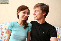 First shy goldhaired teen gets more free in guy's hands and gives her nice tight pink pussy for his mature cock to drill her in all possible ways, and lets him split sperm right on her face